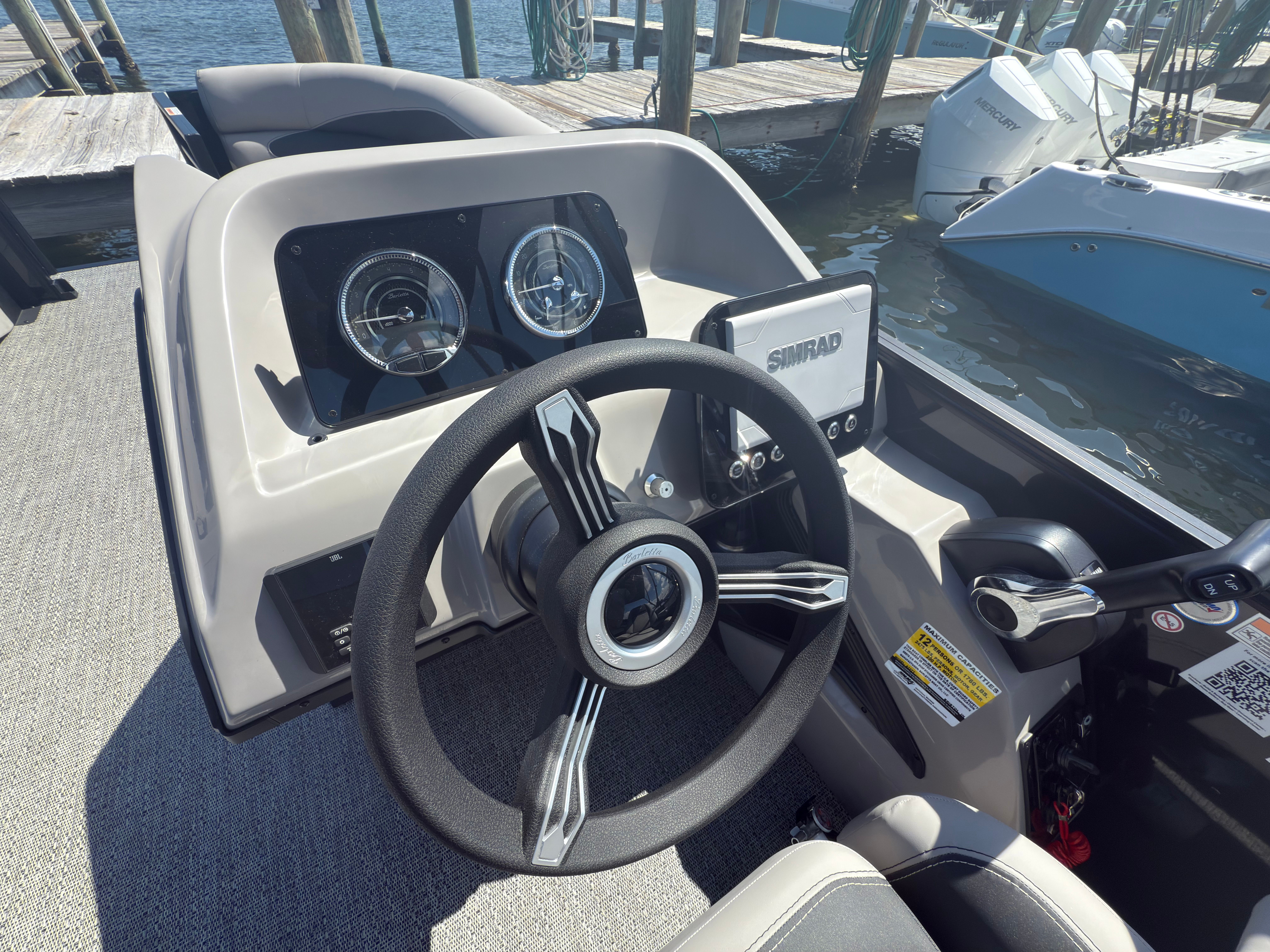 The Barletta Aria A22UC-Platinum is packed with features that elevate your boating experience. The Interior RGB Lighting Package Aria sets the mood for any occasion, allowing you to customize the ambiance with vibrant, adjustable lighting throughout the interior. The On Board Charger Aria ensures your electronics and accessories are always powered up, so you can focus on fun without interruption. The Tempest Gray furniture offers both comfort and durability, creating a welcoming environment for relaxation and socializing. The Simrad 7" G07 XSE display brings advanced navigation and fish-finding capabilities to your fingertips, making it easy to explore new waters or locate the perfect fishing spot. The rigging includes a stainless steel prop for optimal performance and longevity, while the pre-rig for Yamaha mechanical systems ensures seamless integration and reliability.