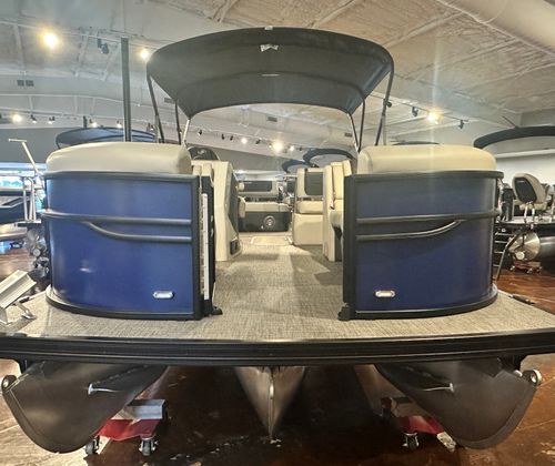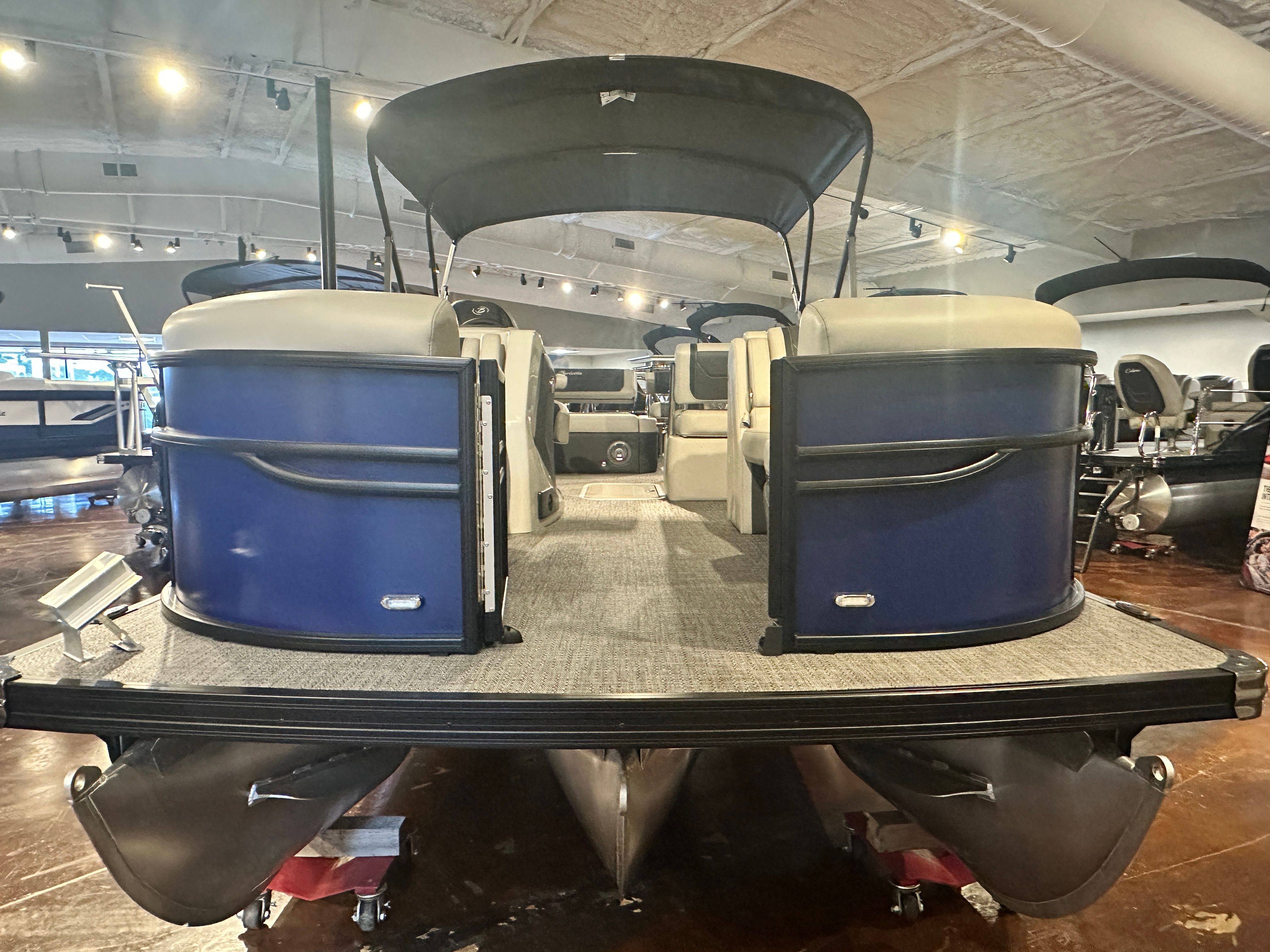 The Barletta Cabrio C24UE is packed with premium features that set it apart from other pontoon boats for sale. The striking Bohemian Blue railskin is complemented by the Blackout Package Cabrio, giving the boat a bold, contemporary look that turns heads at the marina. Inside, the Marquesan Gray with Onyx furniture offers plush seating and a sophisticated atmosphere, while the Amore Gray flooring provides both comfort and durability underfoot.This model is part of the Coastal Edition Cabrio, designed to withstand the rigors of saltwater environments and coastal cruising. The Triple Toon Package with midship storage adds stability, buoyancy, and extra storage space, making it easier to stow gear, water toys, and essentials for a day on the water. The rigging includes a stainless steel prop for optimal performance and a stainless steel flag pole with an American flag, adding a touch of patriotic flair to your boating adventures.