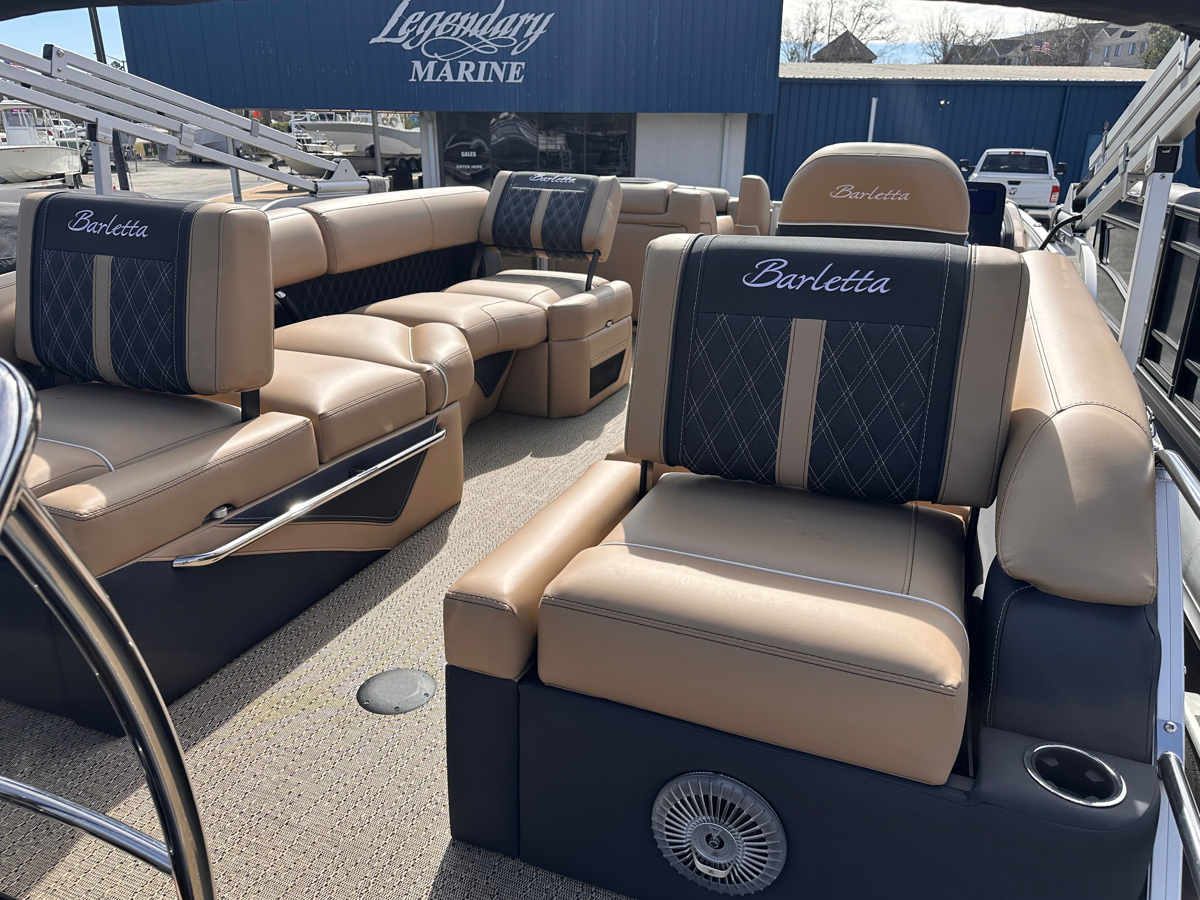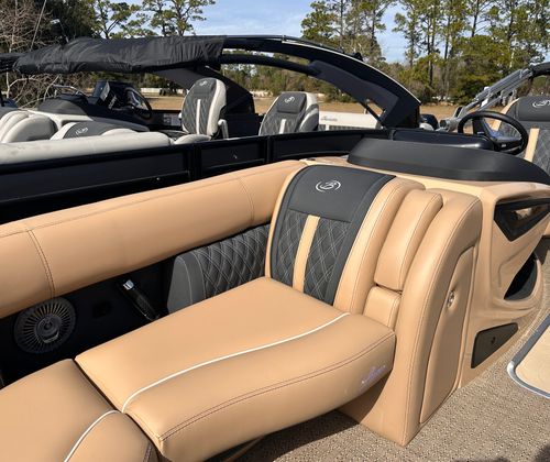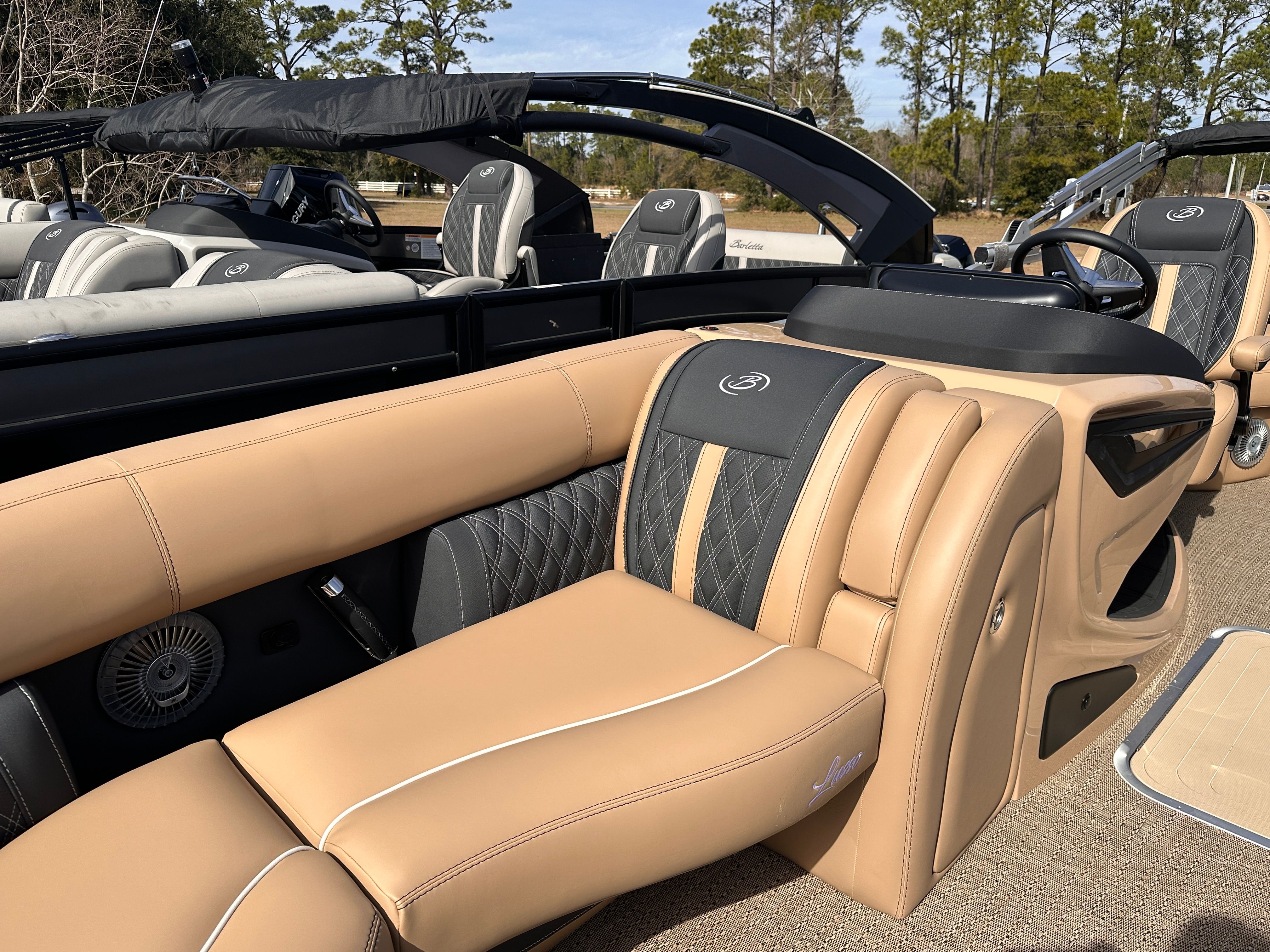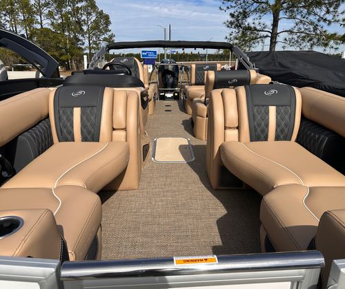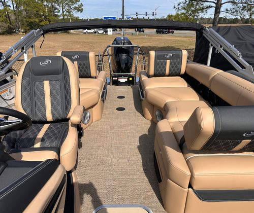 The Barletta Lusso L23M is packed with features that elevate your boating experience to new heights. The Coastal Edition Lusso package enhances both aesthetics and functionality, ensuring you enjoy every moment on board. The exterior boasts a sophisticated Winter White sweep and accent color, creating a striking visual presence on the water. Step inside to discover Carmella Tan furniture with Onyx accents, perfectly complemented by Amore Tan flooring for a warm and inviting atmosphere.For those who appreciate ambiance, the Lusso L23M is equipped with white underdeck and underwater exterior lighting, adding a touch of elegance to evening cruises and making nighttime adventures both safe and visually stunning. Every detail, from the premium upholstery to the thoughtfully designed layout, reflects Barletta’s commitment to luxury and comfort.