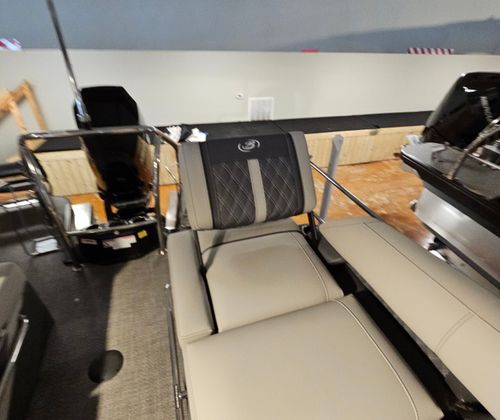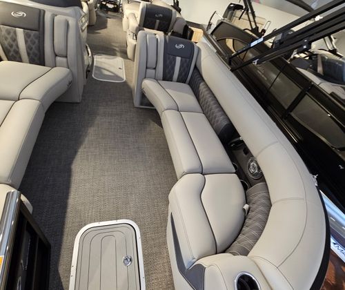The Barletta Lusso L25M is packed with premium features that elevate your boating experience. The Blackout Package Lusso adds a bold, contemporary flair to the railskin, perfectly complementing the Gray Moonstone color scheme. Step aboard and you are greeted by Marquesan Gray furniture with Charcoal accents, creating a plush and inviting atmosphere for relaxation and socializing. The Amore Gray flooring is both stylish and durable, providing a comfortable surface underfoot that stands up to the rigors of active days on the water.This pontoon is part of the exclusive Coastal Edition Lusso, designed for those who appreciate the finer things in life. The double bimini setup, including an additional power bimini, offers versatile shade options, ensuring you and your guests stay cool and comfortable no matter how long you spend on the water. Every detail, from the railskin to the canvas, is meticulously crafted to deliver a seamless blend of function and luxury.
