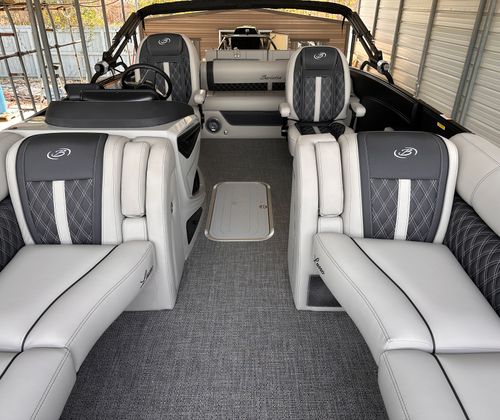 Step aboard the Barletta Lusso L25UC and discover a world of comfort and convenience. The interior features Marquesan Gray furniture with Onyx accents, creating a sophisticated and inviting atmosphere for you and your guests. The Amore Gray flooring adds a touch of elegance while providing durability and easy maintenance, perfect for active days on the water. The Coastal Edition Lusso package enhances the boat’s versatility, making it ideal for a variety of aquatic environments.One of the standout features of this pontoon boat is the double bimini setup, including an additional power bimini. This allows you to effortlessly adjust your shade and shelter, ensuring comfort during sunny afternoons or unexpected weather changes. The Matte Black sweep and accent colors, combined with the Blackout Package Lusso railskin, give the boat a unified and striking appearance that reflects your personal style.