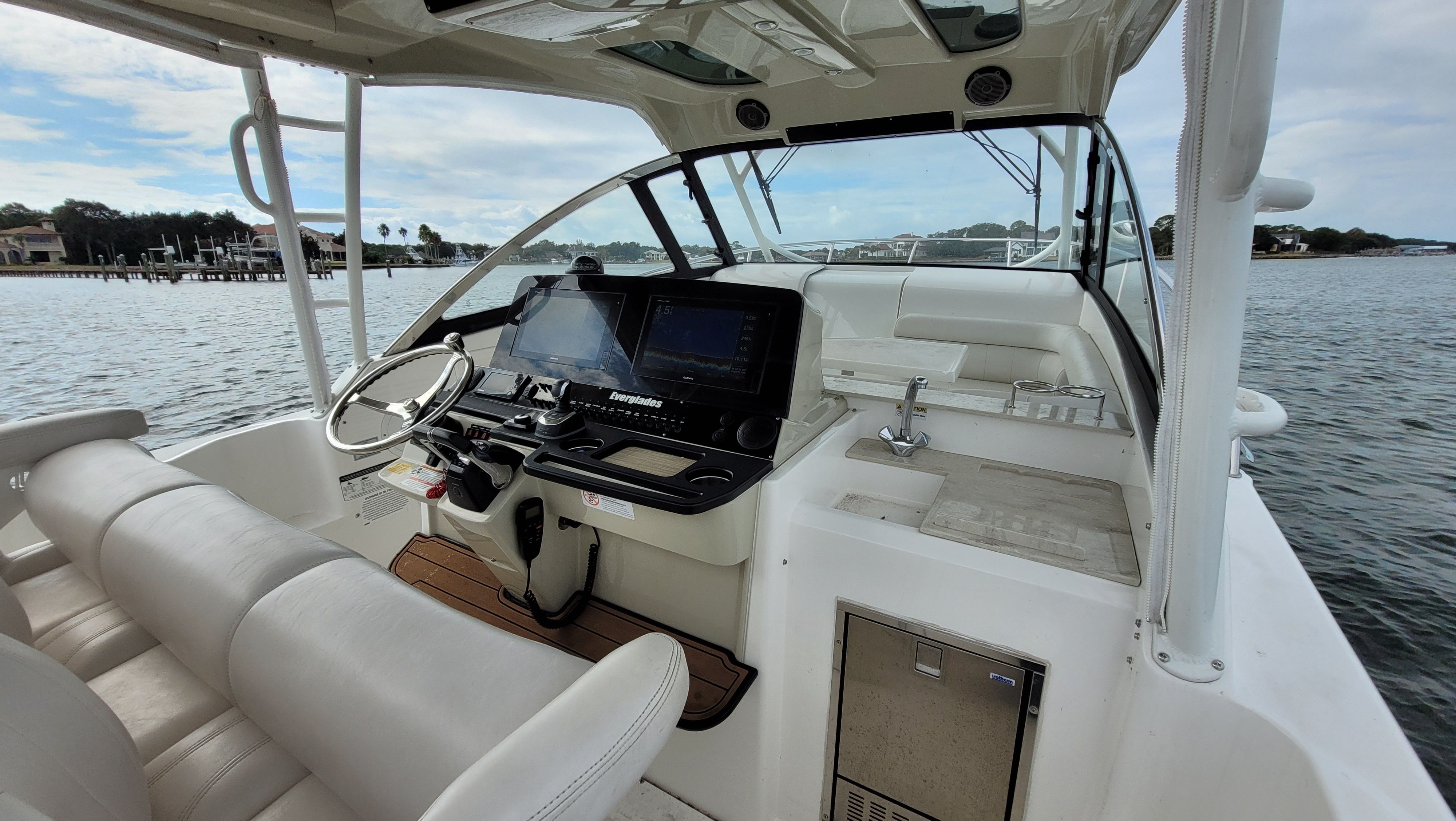 The 2018 Everglades 360 LXC shines in a variety of scenarios, making it a versatile choice for any boating enthusiast. For families, it offers a safe and spacious platform for weekend getaways, water sports, and exploring new destinations. Anglers will appreciate the walkaround design, which provides unobstructed access to the water and plenty of room for casting and reeling in big catches. For those who love to entertain, the generous seating and open deck layout create the perfect atmosphere for hosting friends and enjoying sunset cruises.Whether you are planning a day trip to a secluded beach, a fishing adventure with your crew, or a luxurious escape on the open water, this Everglades boat for sale is equipped to handle it all. Its combination of power, comfort, and versatility ensures that every outing is a memorable one.