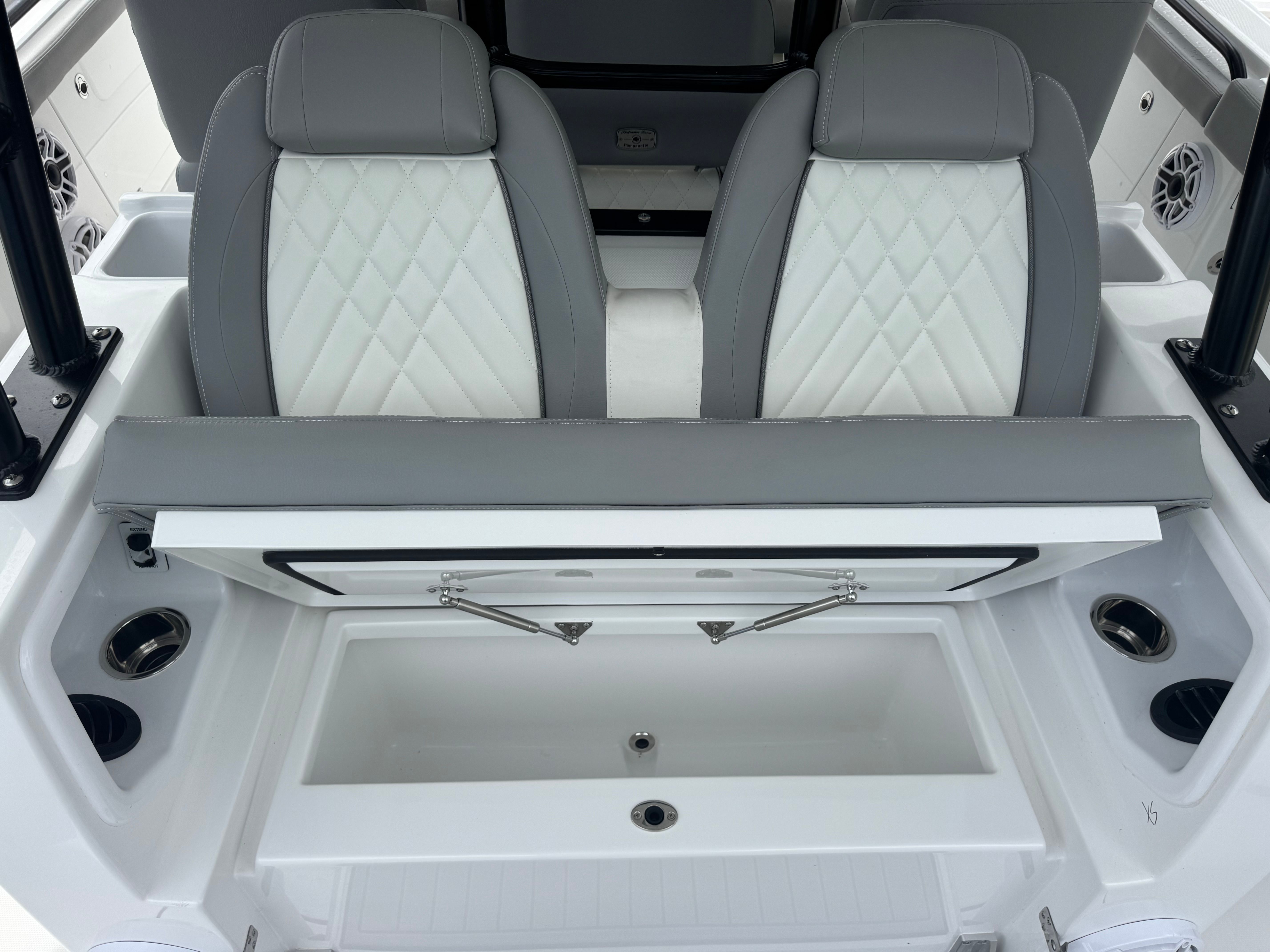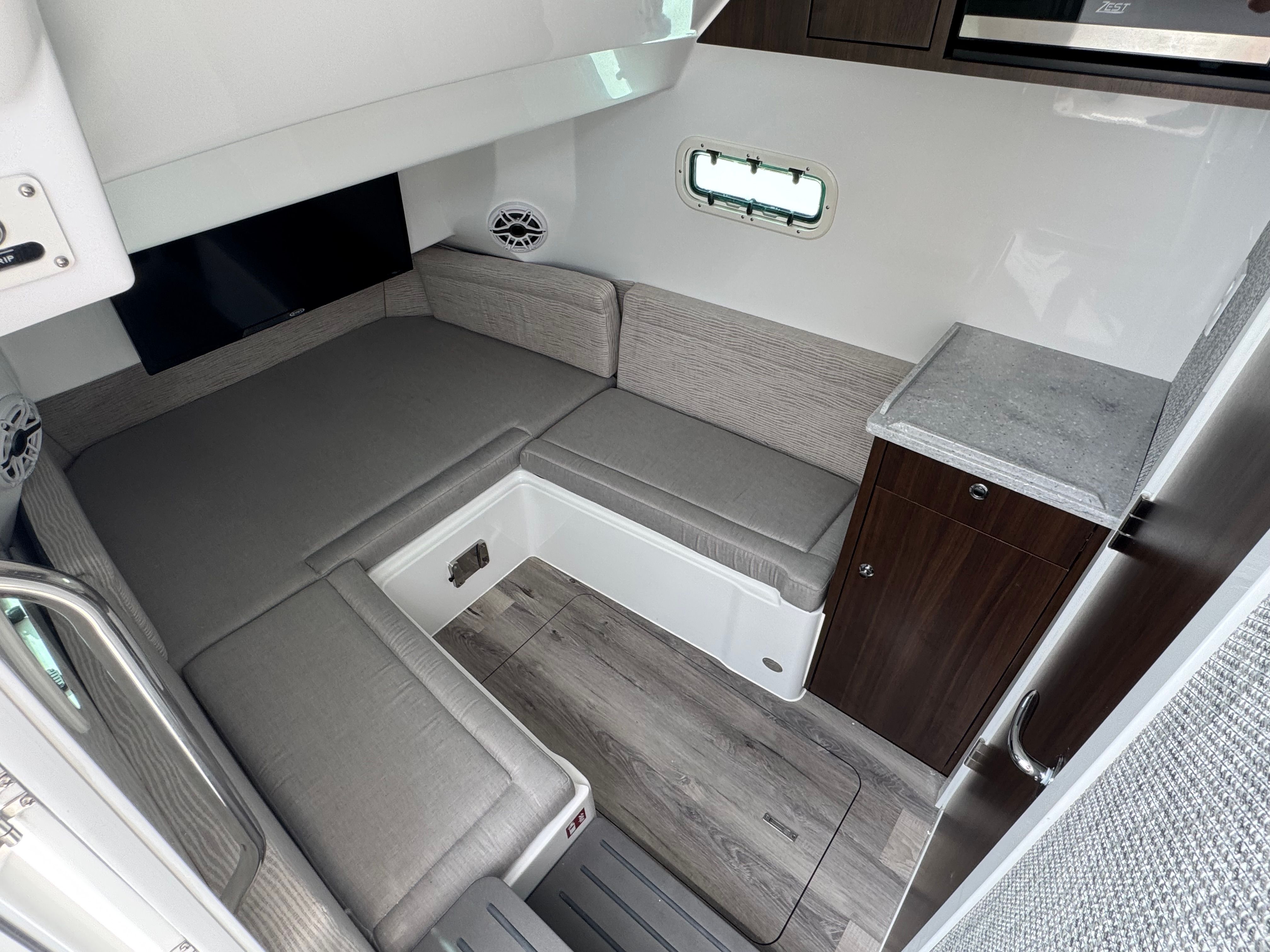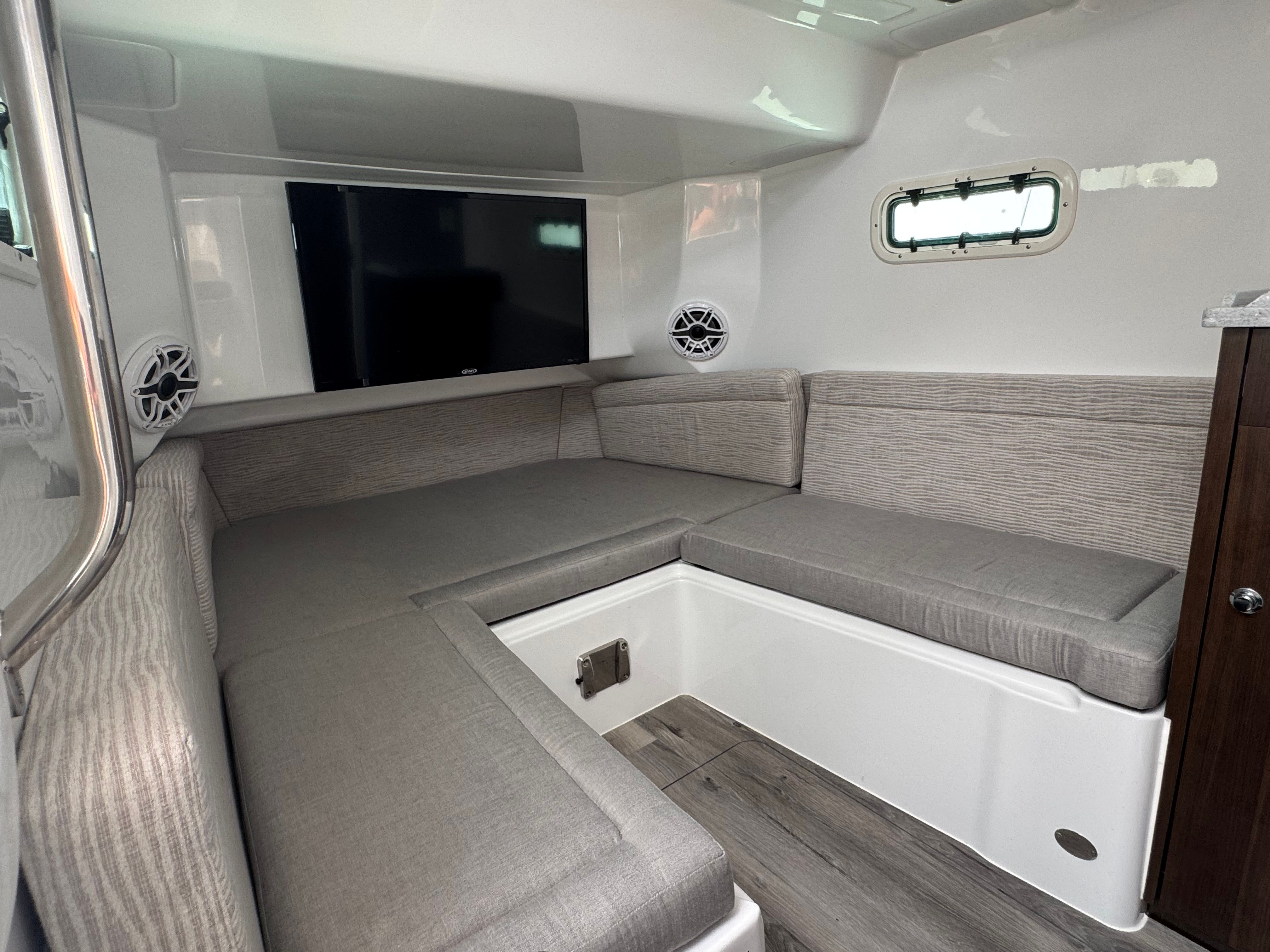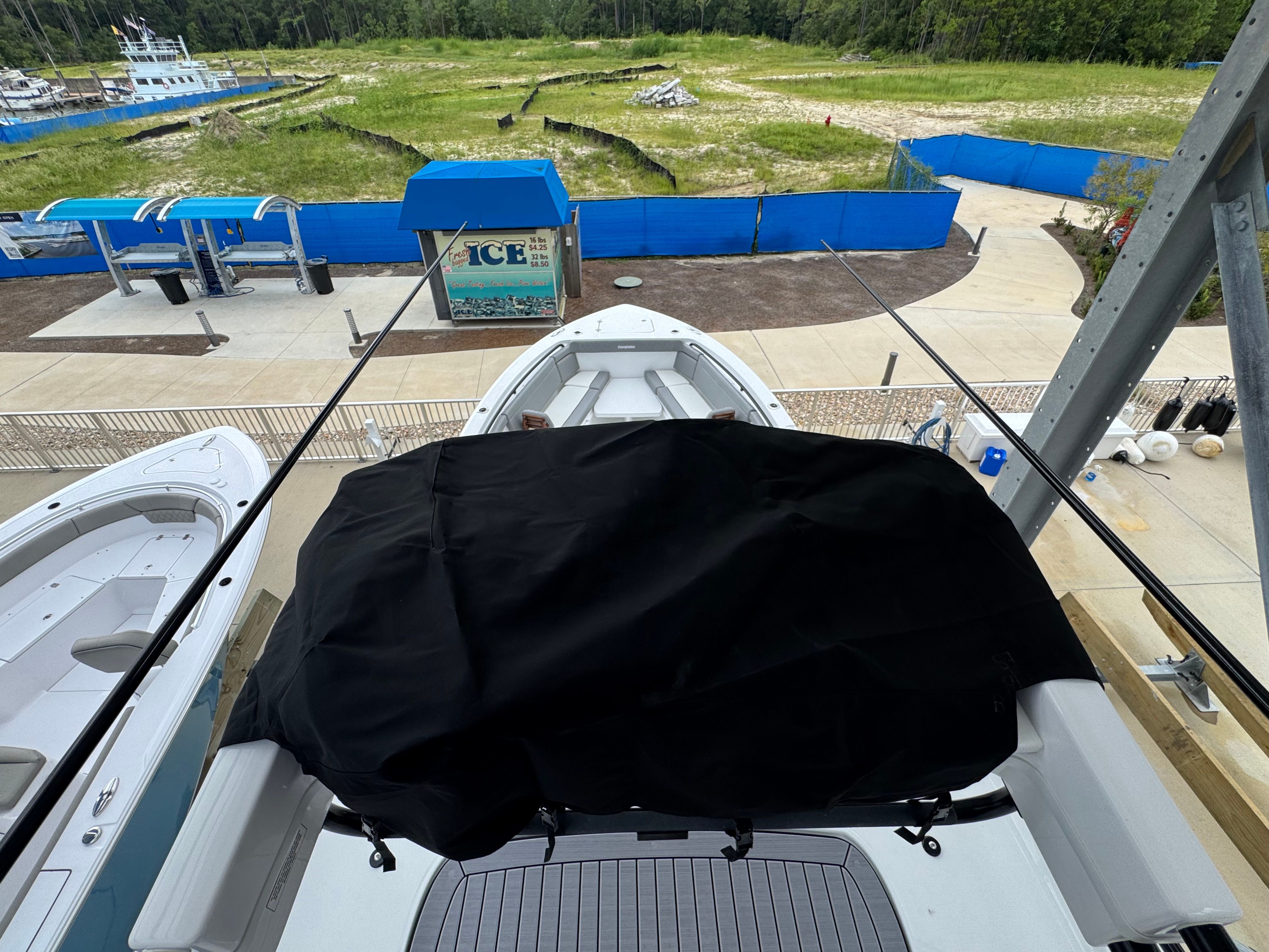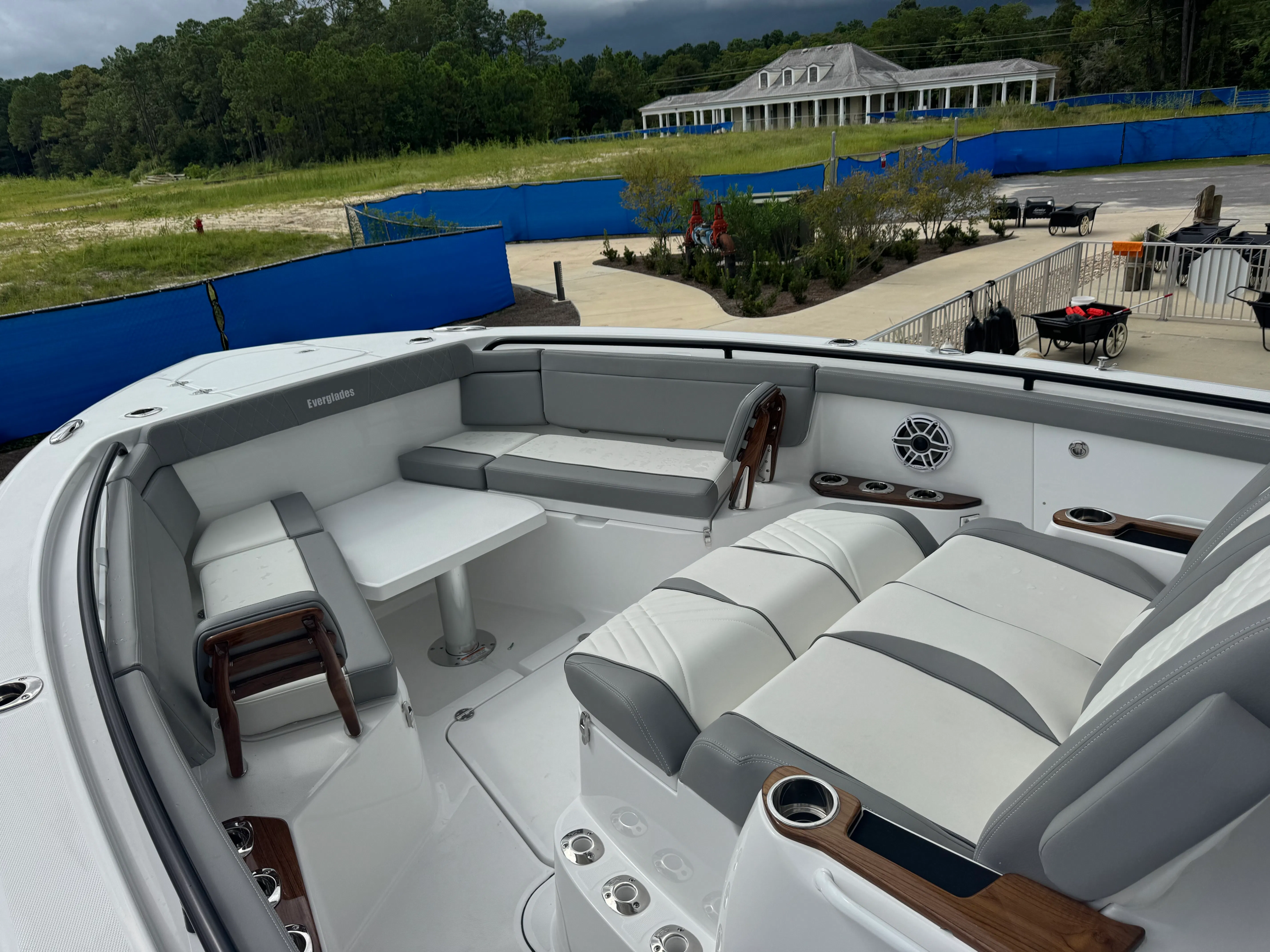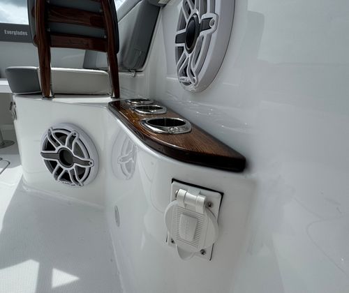 The Everglades 395 CC is loaded with premium features that enhance both functionality and luxury. The Lumitec Lightbar and a set of three spotlights provide superior visibility for early morning departures or nighttime returns, ensuring safety and convenience. The Canvas Package, including an upper station, seat, and console, is finished in a striking black color, offering both protection from the elements and a sophisticated aesthetic.For those who demand comfort at the helm, the shock-mitigating helm seat pedestals (three in total) replace traditional storage drawers, delivering a smoother ride and reducing fatigue during long journeys. The black powder coating extends to the radar and satellite (if chosen), adding a sleek, unified look to the vessel’s profile. The carbon fiber steering wheel upgrade offers a tactile, high-performance feel, while the engine flushing system simplifies maintenance and extends engine life.Teak accents, featured on the dash, cup holders, and armrests, add a touch of classic elegance, especially when paired with the bright finish and Flint Gray upholstery. The Makefast powered awning provides instant shade and comfort, allowing you to create the perfect environment for relaxation or entertaining guests.
