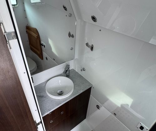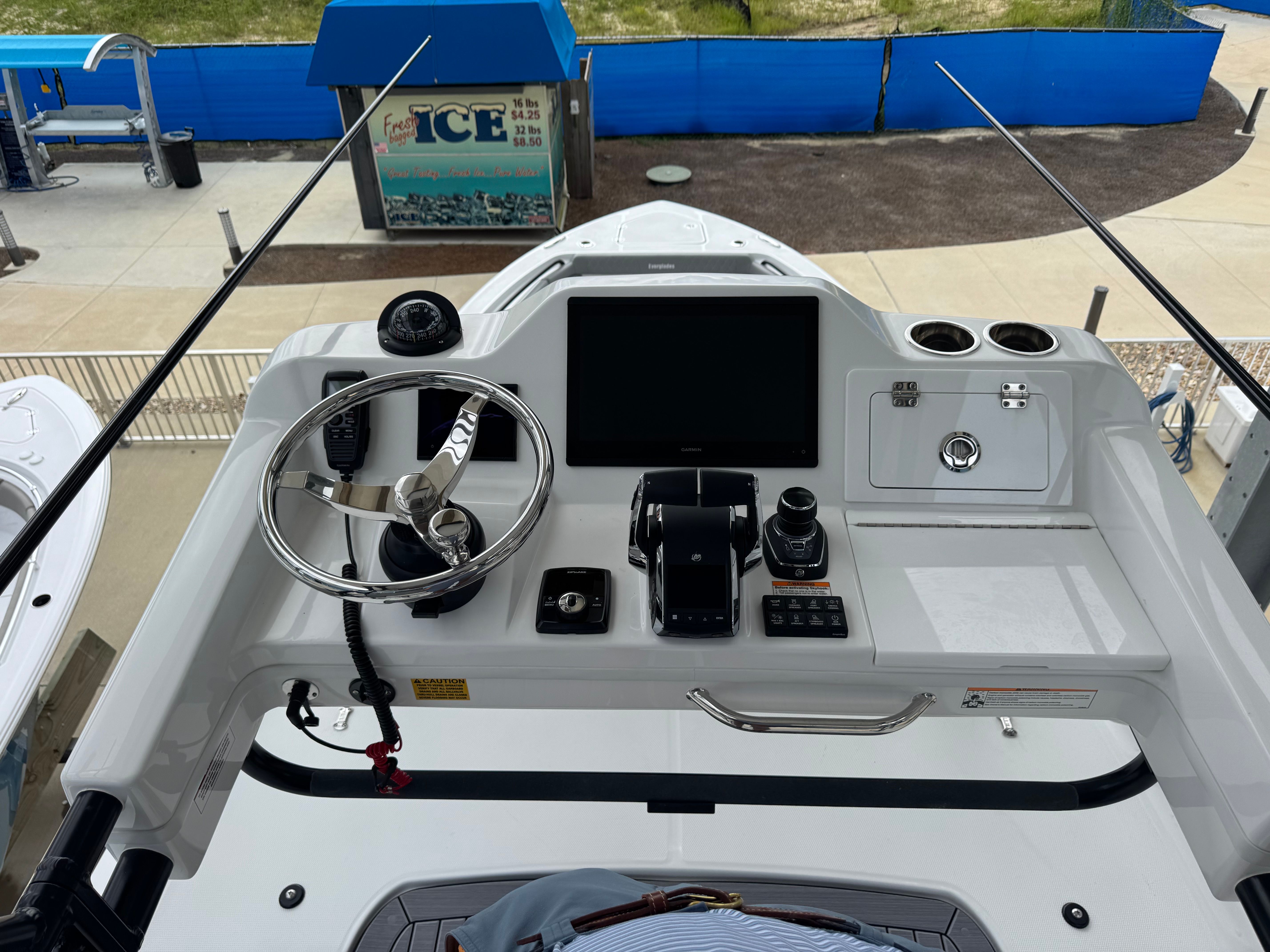 - Full Upper Station - w/ auto pilot and joystick, sun top, 2 drink holders, folding helm seat bolsters, stainless steel grab rail, glove box, Garmin GHS 11 handset, Garmin 8616 additional screen