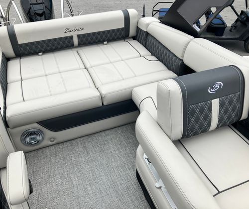 The 2026 Barletta Lusso L25UA is a testament to Barletta’s commitment to quality, innovation, and luxury. Measuring an impressive 27.5 feet in length, this pontoon boat offers ample space for entertaining, relaxing, and enjoying the open water. The Lusso L25UA’s sleek Matte Black sweep color, accented by a sophisticated Champagne hue, ensures that this boat turns heads wherever it goes. The Blackout Package Lusso railskin adds a bold, modern touch, while the Marquesan Gray with Onyx furniture and Amore Gray flooring create an inviting and upscale atmosphere onboard. As a new pontoon boat for sale, the Lusso L25UA is ready to deliver years of memorable adventures.