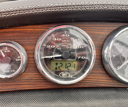 Elegant helm with full instrumentation, including depth finder and air/water temp gauge.