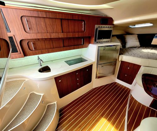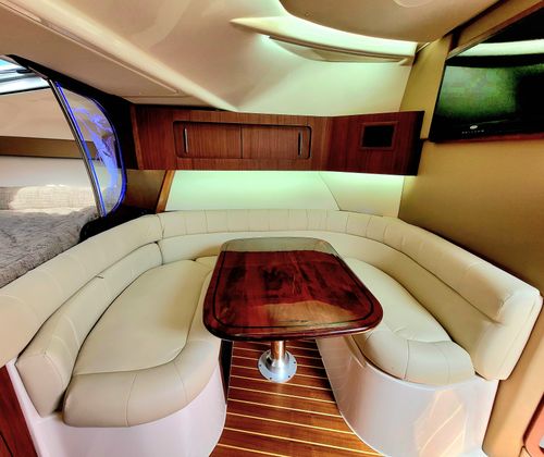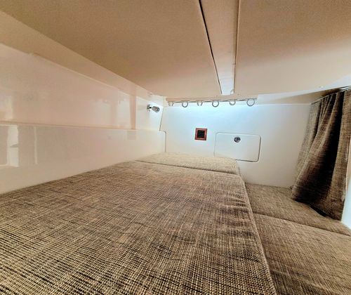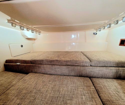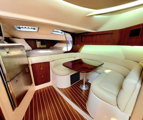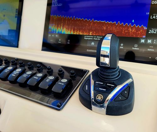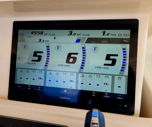 This model truly does do it all, its generous 13'2" beam affords an expansive cockpit and well appointed Helm area with extensive electronics including Garmin MFD's, Sea Keeper 5 Gyro, FLIR infra red camera and Tracvision Sat TV and Radar. Down below a grand cabin complete with galley to port and a convertible dinette area and enclosed head starboard. Then aft is a comfortable cabin. Options include: