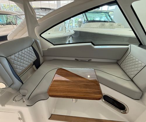 The Pursuit DC 326 is loaded with special features designed to enhance your boating experience. The twin Yamaha F350XSA2 engines provide robust performance, while the joystick control ensures effortless navigation and docking. The hull’s fresh white color, complemented by a black boot stripe with black accent, creates a timeless and elegant appearance. Inside, the helm and footrest feature a sleek carbon color, and the interior is finished in Tranquil Sea, offering a serene and inviting atmosphere.For added convenience and comfort, the DC 326 is equipped with a 110V/60HZ 5.0KW genset, providing reliable power for all your onboard systems. The 110V/60HZ cabin and bridgedeck air conditioning package ensures a cool and comfortable environment, even on the hottest days. Entertaining is a breeze with the 110V cockpit grill, perfect for preparing delicious meals while enjoying the water. The helm control hardtop-mounted LED spotlight enhances visibility and safety during nighttime excursions, giving you peace of mind wherever your adventures take you.