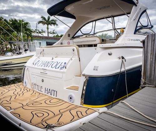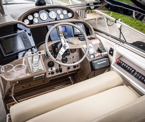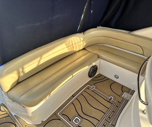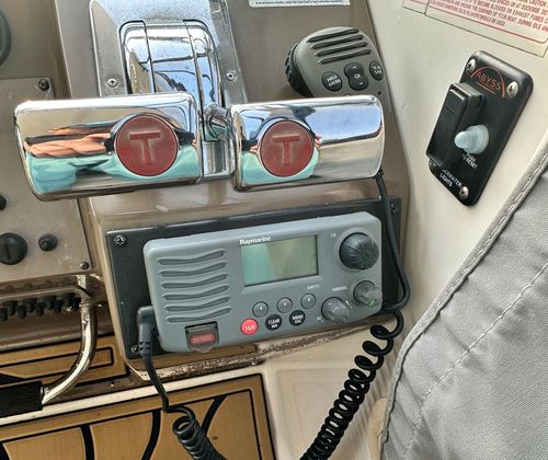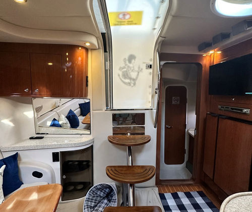 Salon • Chrome Overhead Lighting With Dimmer • Removable dinette table • Overhead Skylight Hatch With Blinds and Screen • Recliner Seating Galley • Hardwood Flooring • Corian Countertops • Stainless Steel Sink • Electric Stove (2 Burner) • Microwave • Nova Kool Refrigerator and Freezer Combo (7.5 Cubic Ft.) • 11 Gallon Waste Receptacle Forward Stateroom and Head • Inner Spring Mattress With Storage Underneath • Overhead Hatch • Two Hanging Lockers With Cedar Lining • Double-wide Sliding Privacy Door • Vacuflush Toilet • Full Fiberglass Stand-Up Head With Settee • Cultured Marble Floor • A/C Vent • Carbon Monoxide Detector Mid Cabin Stateroom and Head • Twin Beds Convert to Queen Size Berth • Overhead Vanity Cabinet • Under Mattress Storage • Full Fiberglass Head Compartment With Stand-up Shower • Vacuflush Toilet • Garmin 820xs With 8" Color Screen and HD-ID, CHIRP and DownVü with CHIRP Sonar Technology • Raymarine AutoPilot System and Depth Sounder • Raymarine VHF • Abyss Underwater Lighting • Fusion Apollo Stereo System With JL Audio and Fusion Speakers