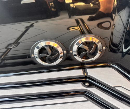 Four JL tower speakers, dual 12" subs, amplifiers, and a transom remote for exceptional on-water audio.